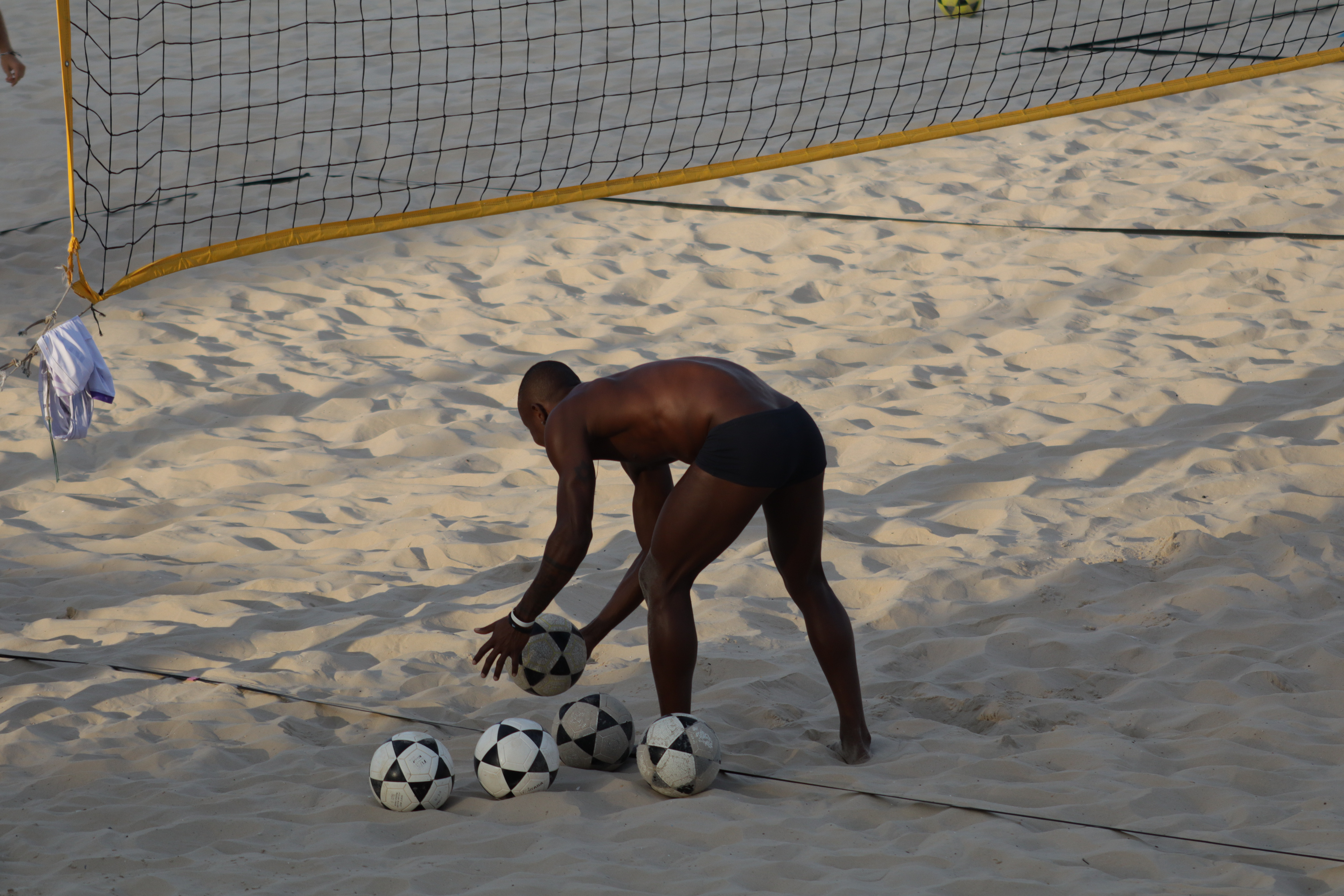 A captivating scene unfolds on a sunlit beach, bathed in the warm golden glow of the late afternoon. The photograph captures an athletic man, his muscular physique highlighted by the natural light, as he bends forward, carefully arranging a series of black-and-white patterned soccer balls on the soft, fine sand. His minimal attire, a pair of dark swim trunks, emphasizes the environment's relaxed, beachside ambiance, while the positioning of his body reveals his focus and precision, as if he's preparing for some upcoming action or drill.