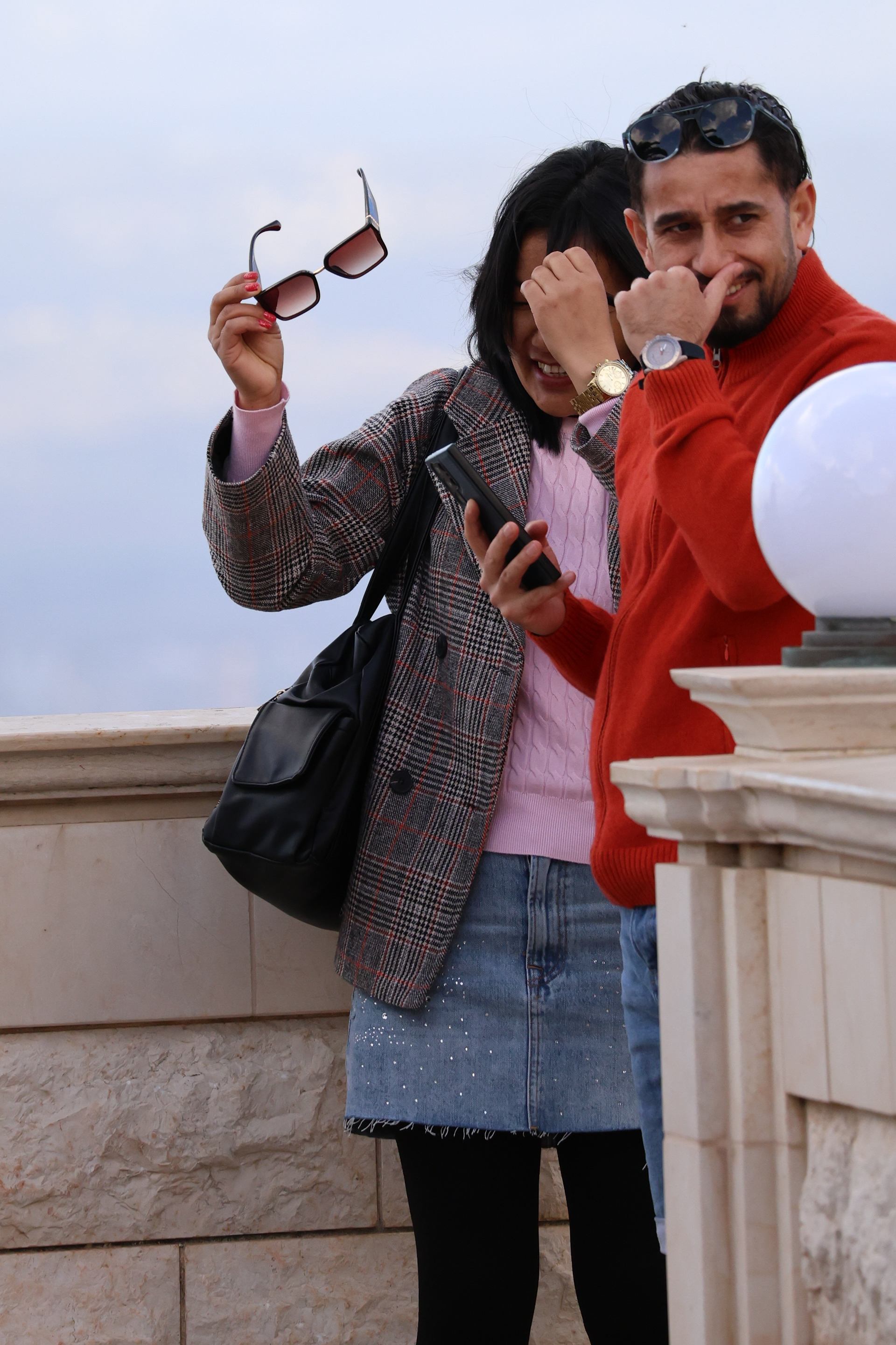 Next to her, the man in the bright orange sweater becomes the counterweight. He’s squinting toward the light, maybe joking about it, maybe sharing whatever amused expression made him pinch the bridge of his nose. His sunglasses pushed up on his head mirror hers in a funny visual echo—two people both prepared for sun that never quite arrived. His watch gleams in the diffuse light, the gold catching just enough shine to break up the matte warmth of the knit. Between them, phones peek out as accessories of modern life, casually held, neither staged nor hidden.